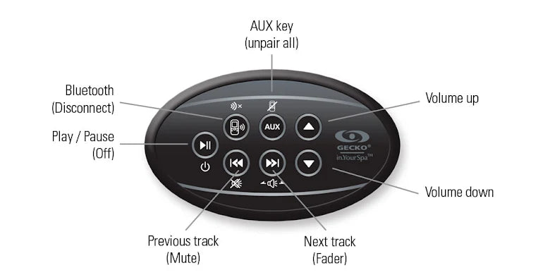 7 knappar: Ström / Bluetooth / AUX / Volym upp - ned / föregående spår / nästa spår