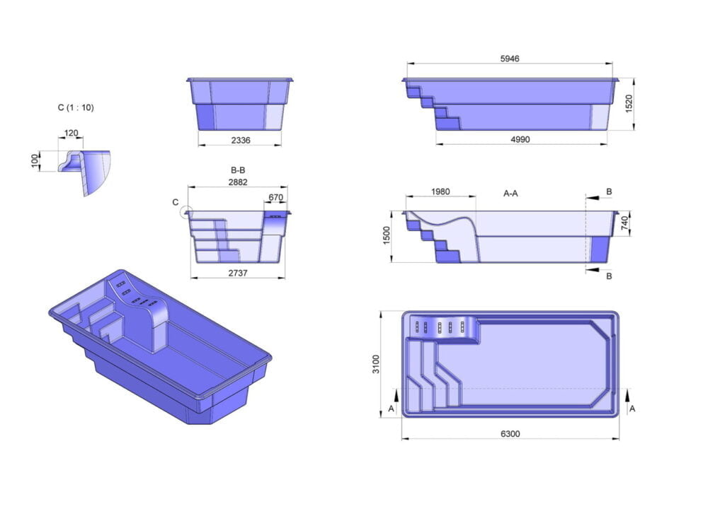 Letar du efter en glasfiberpool som kombinerar design, badkomfort och hållbarhet? Runn är en modern pool med slät yta och ett uttryck som passar både nybyggt och klassisk villa. Storleken 6,3×3,1×1,5 m (L×B×D) gör den extra lätt att planera in i trädgården.