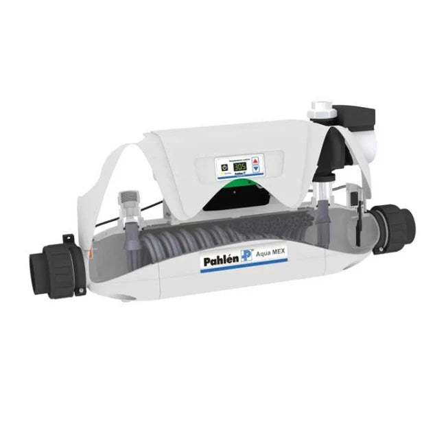 Den fullt utrustade Aqua MEX har en inbyggd trestegs enfas cirkulationspump för primärsidan (varmvattnet) och en inbyggd temperatursensor, flödesvakt och backventil. Den är också utrustad med två avtappningspluggar på sekundärsidan (poolvattnet) för att enkelt kunna tömmas på vatten.